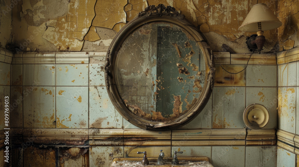 wabi sabi decor, a worn mirror in a wabi sabi bathroom wall imbuing