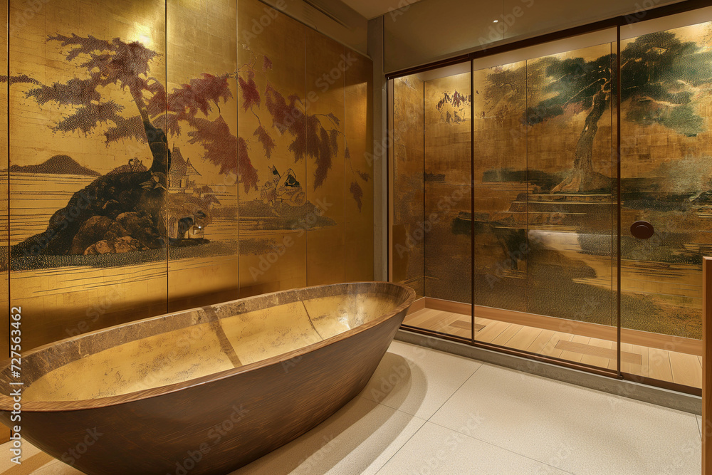 Modern Wabi Sabi Japanese bathroom with an artisan bathtub, glass